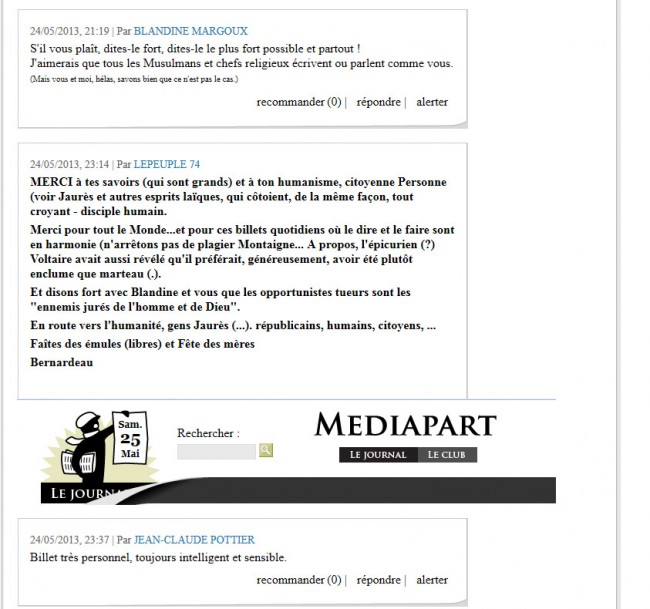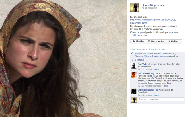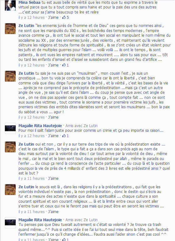 C’est clair en regardant le billet qu’il n’y a pas de déprime, c’est excellent. Je vous parlais de la phrase « Le coran est un livre universel, ceux qui font le mal en son nom sont des gros nuls. » que Personne aurait dite. Mais ce serait une reformulation du contenu du billet selon vous? Et non pas une phrase qu’elle aurait dite avant ce billet? C’est juste. J’m’suis encore planté, je ferais mieux de dormir.