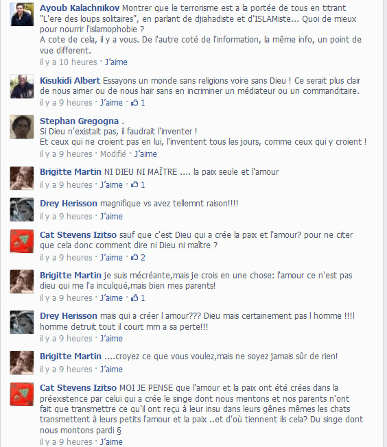 La France accorde le droit de penser, d’opinion, pour montrer que c’est elle, la religieuse qui dispose de la tête des gens, alors que penser est un don de Dieu, un don naturel. Voilà le genre de rhétorique qui réussit à effacer de la tête des gens qu’ils sont libres de penser et ce n’est pas « Liberté de penser » de je ne sais plus quel chanteur qui l’empêche de s’enrichir, en se la coulant douce comme Depardieu dans un pays pas regardant et donc libre pour ceux qui ont du fric, les paradis fiscaux attirent le fric, les pauvres la misère.