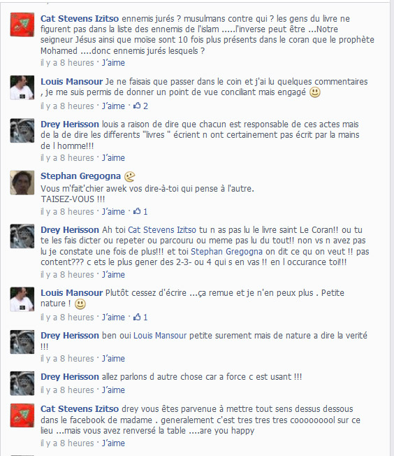 Je m’explique. si on dit « le coran est nul, il n’y a que des versets guerriers » on confirme l’interprétation des extrémistes. alors qu’il faut dire, comme Personne; « Le coran est un livre universel, ceux qui font le mal en son nom sont des gros nuls. » Je dirai que, puisque le coran se prétend lui-même livre universel, les esprits éclairés de tous les horizons devraient se l’approprier, et jeter à la figure des intégristes les versets les plus beaux… et les interprétations les plus sensées. Le coran n’appartient à personne, et c’est une erreur, que commettent également les musulmans, de le laisser aux seuls intégristes musulmans.